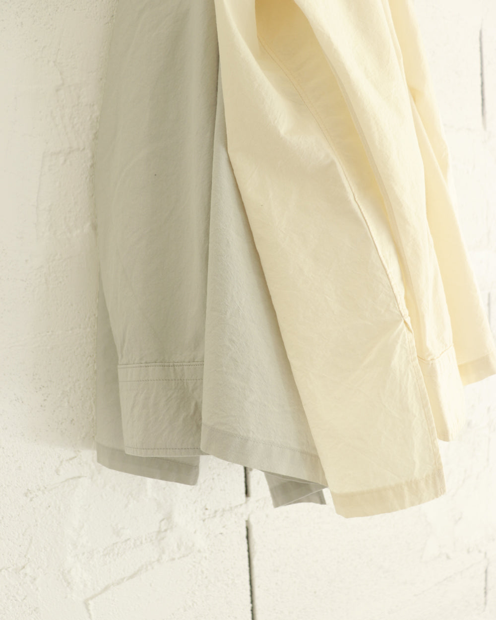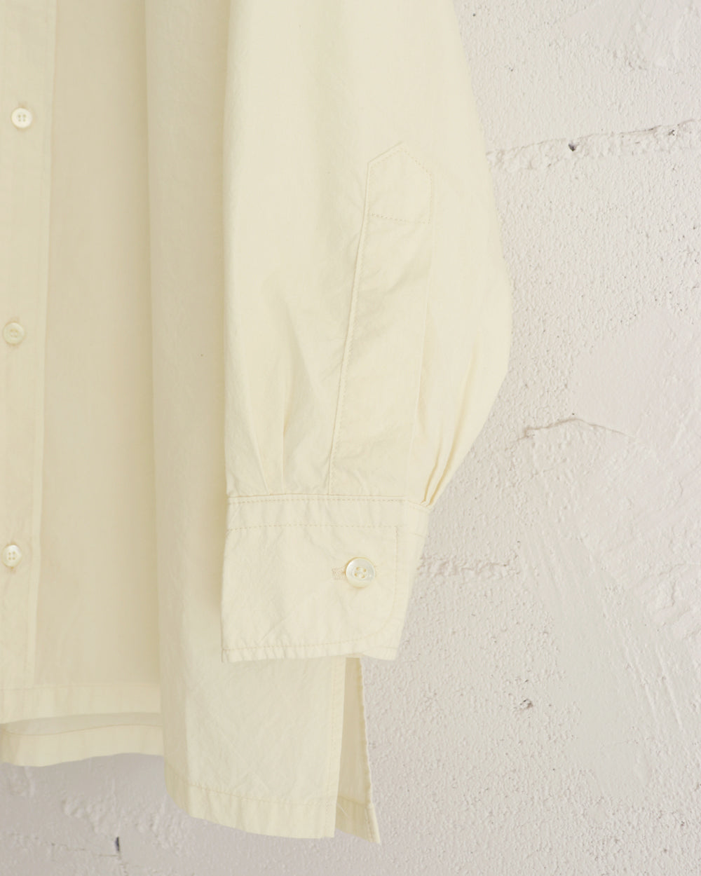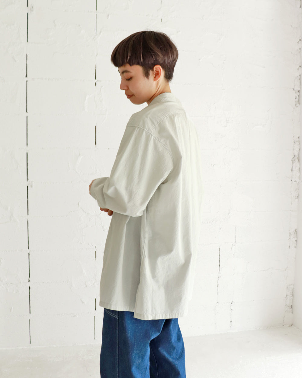 襟元はコンパクト目なすっきりとしたレギュラーカラー仕様、ポケットが付かないミニマルなデザインです。