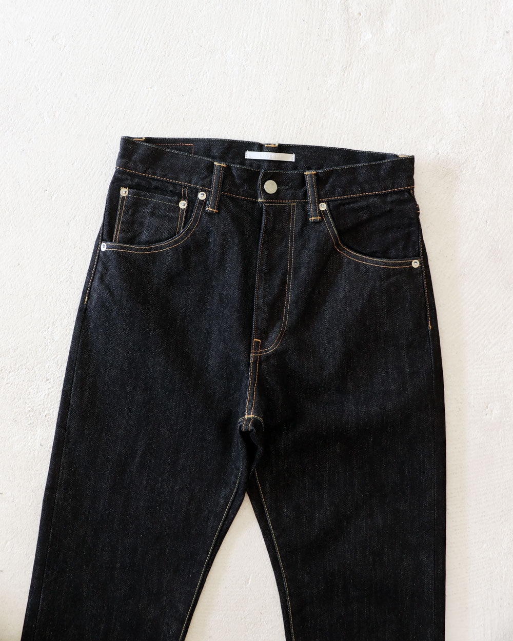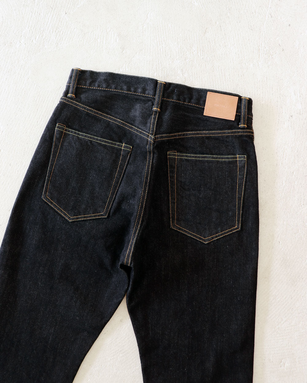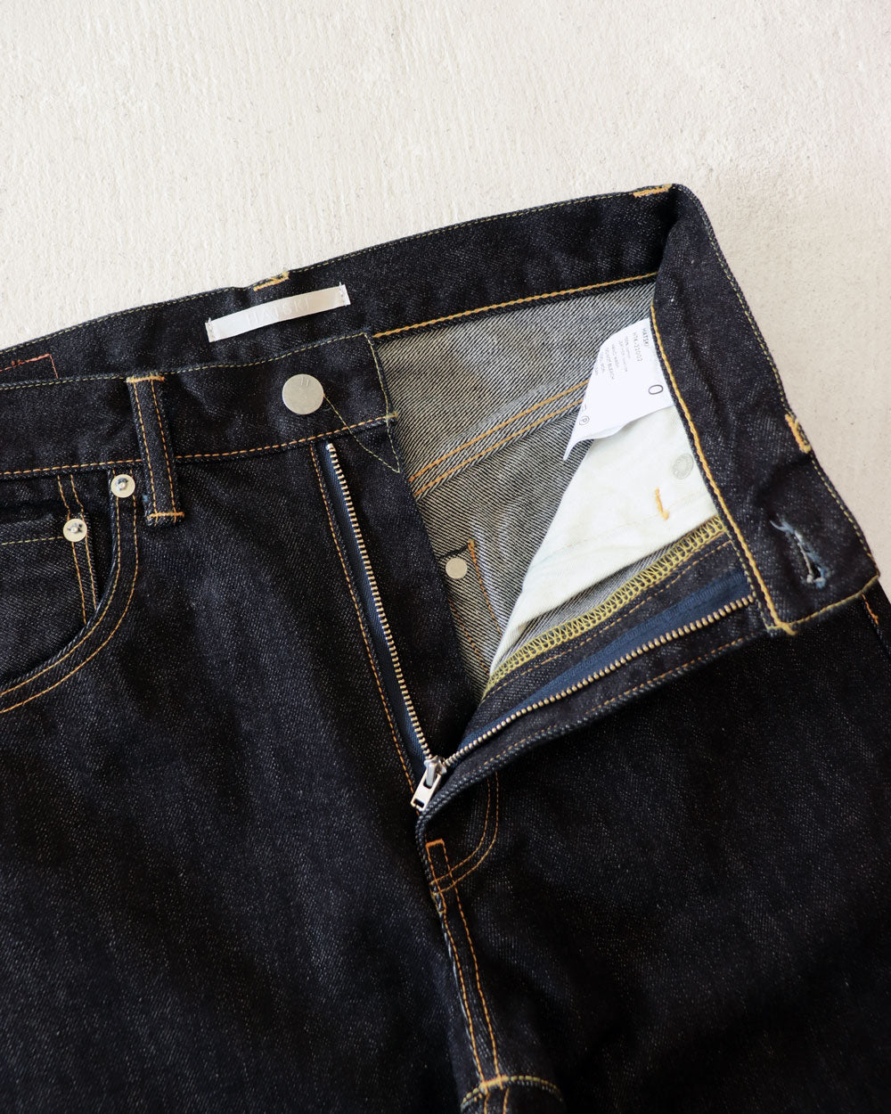 すっきりとしたシルエットながら、ラインを拾いすぎない絶妙なフィット感が魅力です。フロントはジップフライ、隠しリベット、丸みのあるベルトループ、糸番手などこだわりの詰まったディティール。