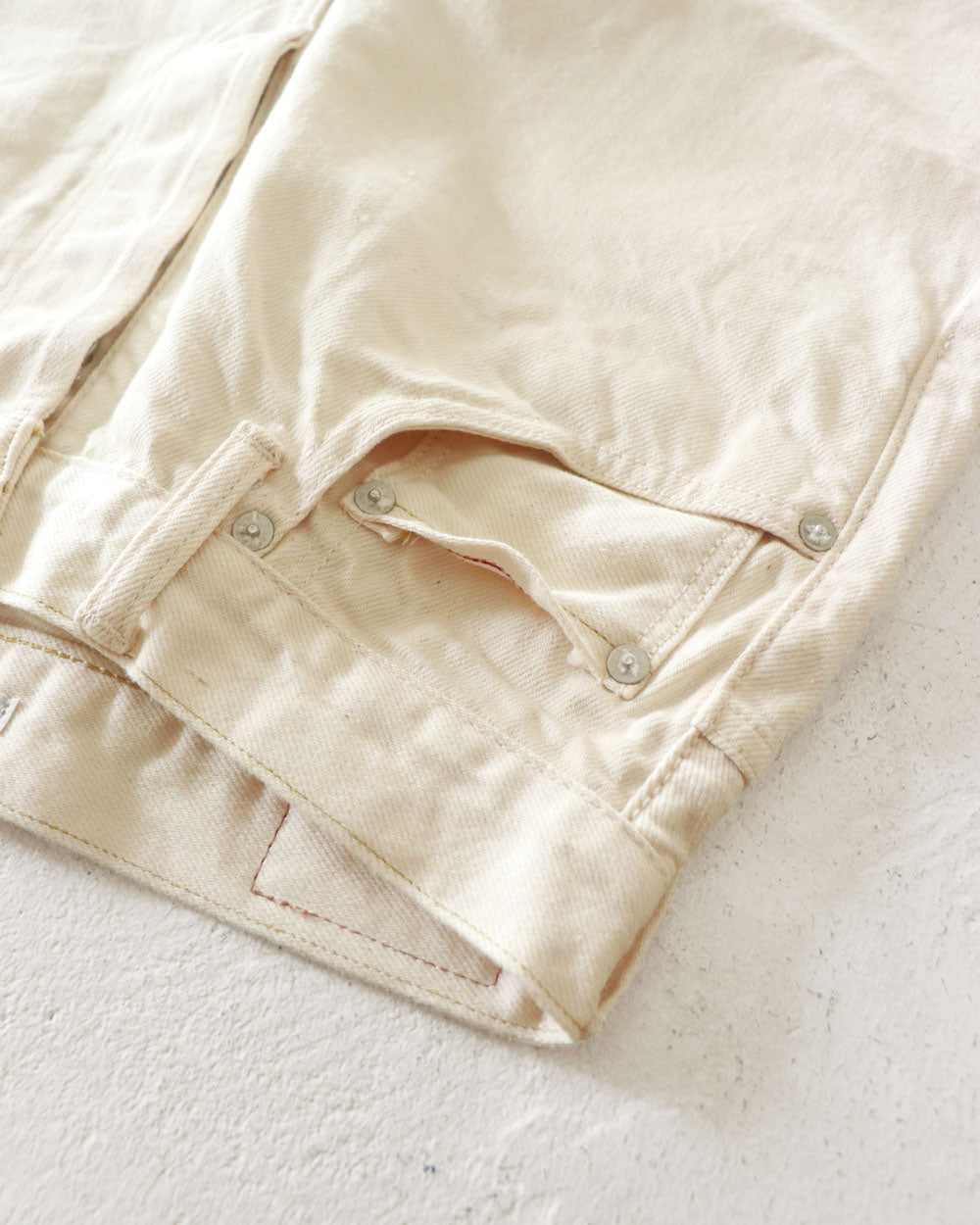 フロントはオリジナルボタンフライ、隠しリベット、丸みのあるベルトループ、糸番手などこだわりの詰まったディティール。