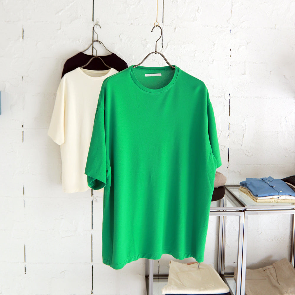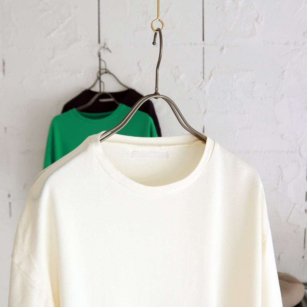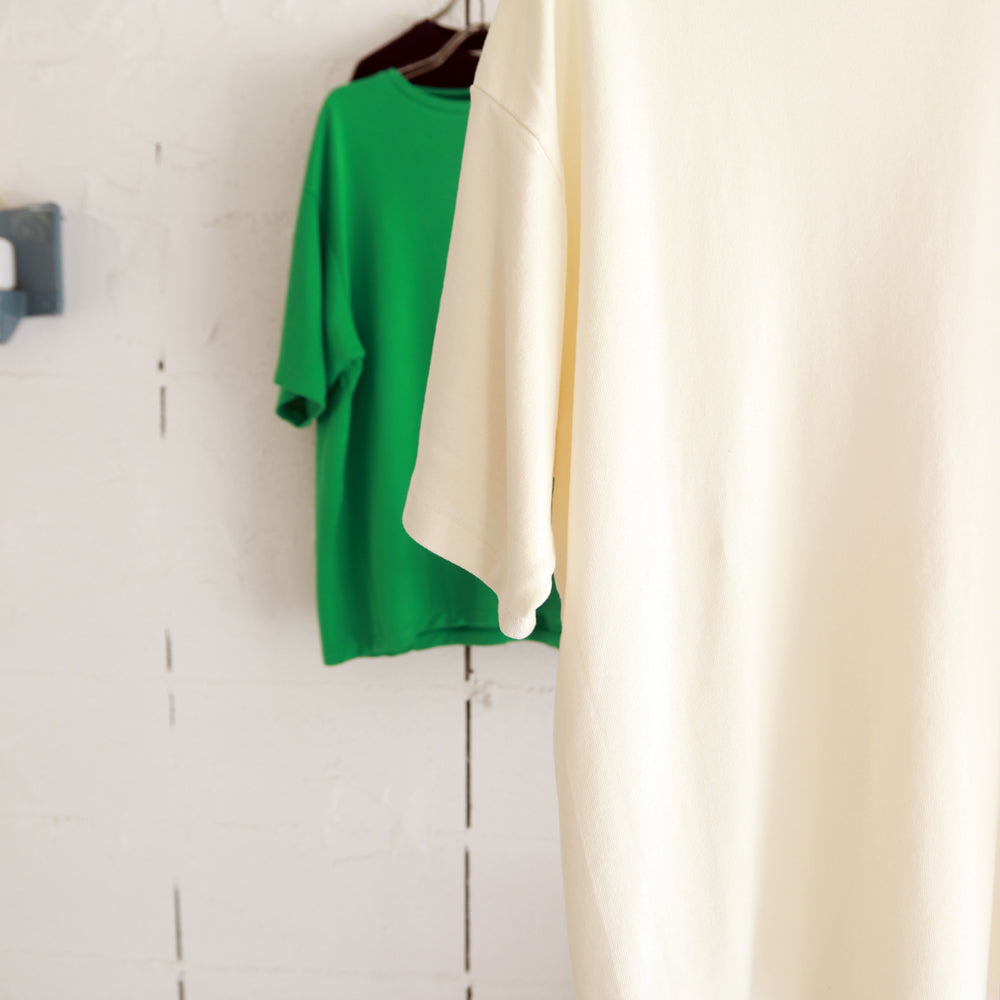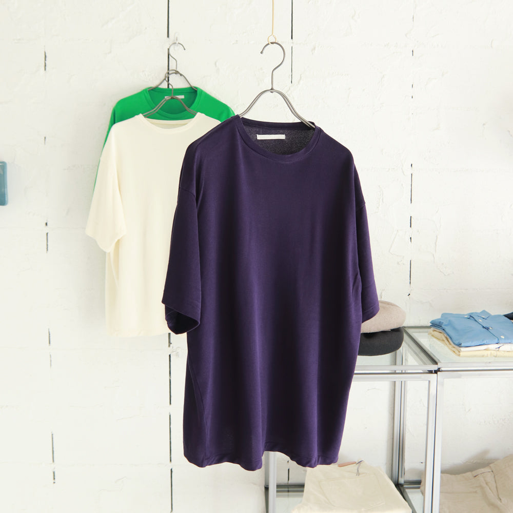 安心感のある程良い肉厚の生地感ながら、ドライなタッチ感なのでさらっとした着心地が特徴。