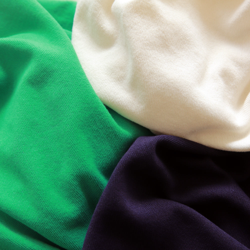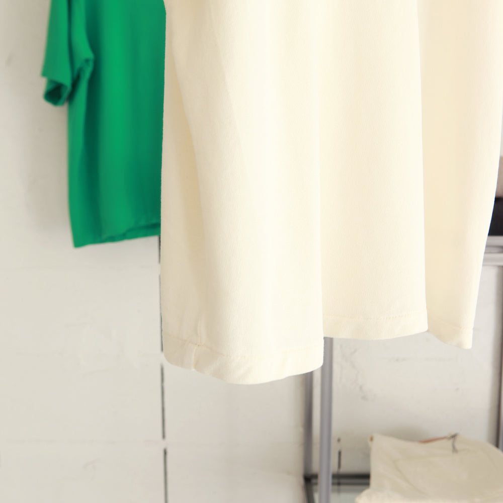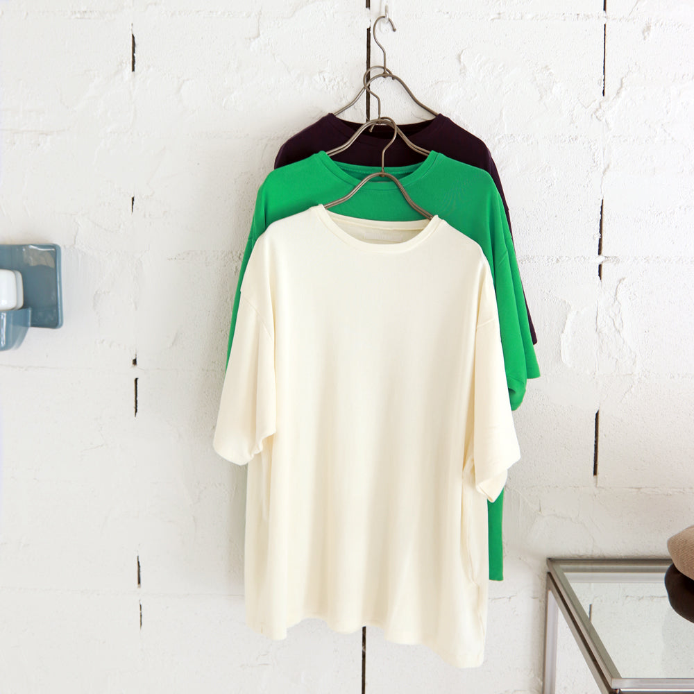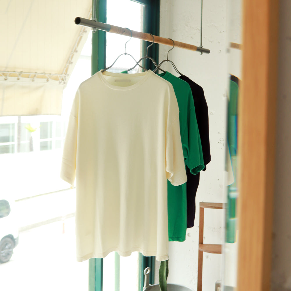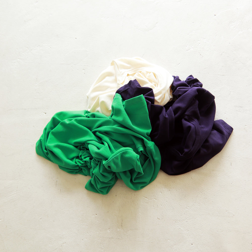 安心感のある程良い肉厚の生地感ながら、ドライなタッチ感なのでさらっとした着心地が特徴。